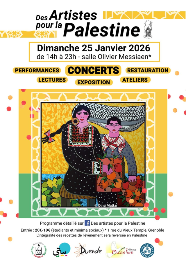 Des artistes pour la Palestine samedi 10 janvier 2026 25 janvier 2026 Des artistes pour la Palestine Dimanche 25 janvier de 14h00 à 23h00 CET Salle Olivier Messiaen